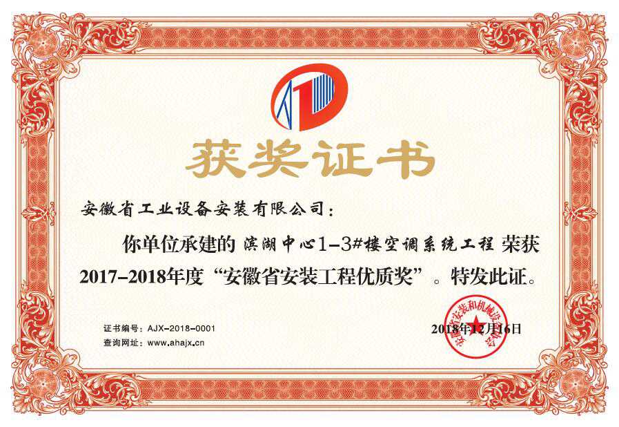 根據(jù)《中國安裝工程優(yōu)質(zhì)獎(jiǎng)(中國安裝之星)評選辦法》(安協(xié)〔2015〕19號)、《關(guān)于開展“2017-2018 年度中國安裝工程優(yōu)質(zhì)獎(jiǎng)(中國安裝之星)第一批評選活動”的通知》(安協(xié)〔2017〕7 號)要求,協(xié)會做為我省推薦單位,組織專家對七個(gè)申報(bào)中國安裝工程優(yōu)質(zhì)獎(jiǎng)項(xiàng)目,進(jìn)行檢查驗(yàn)收,一致認(rèn)為,均代表我省安裝行業(yè)優(yōu)質(zhì)水平。為表彰先進(jìn),樹立標(biāo)桿,經(jīng)研究決定授予安徽省工業(yè)設(shè)備安裝有限公司“濱湖中心1-3#樓空調(diào)系統(tǒng)工程”等七項(xiàng)工程榮獲2017-2018年度“安徽省安裝工程優(yōu)質(zhì)獎(jiǎng)”。并在協(xié)會第七屆三次理事(擴(kuò)大)會議上通報(bào)表彰。協(xié)會希望各獲獎(jiǎng)單位珍惜榮譽(yù),再接再厲,繼續(xù)探索爭先創(chuàng)優(yōu)的經(jīng)驗(yàn),充分發(fā)揮示范引領(lǐng)作用,各協(xié)會會員單位要以獲獎(jiǎng)單位為榜樣,牢固樹立質(zhì)量第一意識,多出精品,多創(chuàng)名品,為質(zhì)量強(qiáng)省,提質(zhì)優(yōu)效,轉(zhuǎn)型升級發(fā)展而努力。