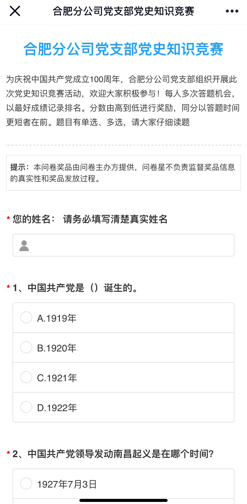為慶祝中國共產(chǎn)黨成立100周年,持續(xù)推進(jìn)黨史學(xué)習(xí)教育,引導(dǎo)分公司黨員干部學(xué)史明理、學(xué)史增信、學(xué)史崇德、學(xué)史力行,營造“知史愛黨、知史愛國”的良好氛圍,4月26日-27日,合肥分公司黨支部組織開展了黨史學(xué)習(xí)教育知識競賽活動(dòng)。