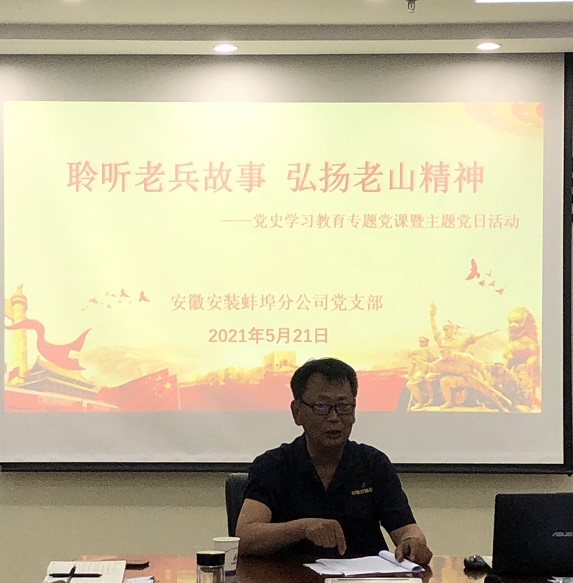 為深入開展黨史學(xué)習(xí)教育活動(dòng),進(jìn)一步引導(dǎo)黨員干部學(xué)習(xí)黨史、銘記黨史,5月21日下午,蚌埠分公司黨支部組織開展了一場“聆聽老兵故事 弘揚(yáng)老山精神”黨史學(xué)習(xí)教育專題黨課暨主題黨日活動(dòng)。邀請(qǐng)?jiān)鴧⒓舆^對(duì)越自衛(wèi)反擊戰(zhàn)的退伍老兵,分公司在職員工年飛同志為大家上了一堂別開生面的黨課。分公司班子成員、項(xiàng)目經(jīng)理、部門負(fù)責(zé)人及全體黨員參會(huì)。