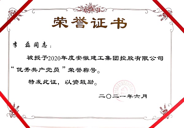 作為一名共產黨員,他處處以黨員的標準嚴格要求自己,聯系群眾和遵紀守法等各方面都較好的發(fā)揮著共產黨員的先鋒模范作用,得到領導和同事們的一致好評,榮獲2020年度“建工集團年度優(yōu)秀共產黨員”稱號。