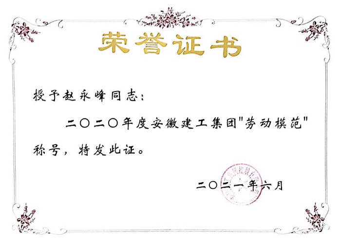 2019年3月,根據(jù)安徽安裝公司拓展市場、加快發(fā)展的工作要求,趙永峰勇挑重擔,擔負起了合肥分公司“開拓市場一片天”的重任,團結(jié)帶領分公司班子成員和全體員工立足新起點、整裝再出發(fā),努力為實現(xiàn)分公司新一輪大發(fā)展而不懈奮斗,取得的可喜成績得到了領導和員工們的一致認可和稱贊。受到安徽建工集團及安徽省工業(yè)設備安裝有限公司的表彰,在2021年7月1日-2日召開的安徽建工集團控股有限公司二屆一次職工代表大會暨“七一”表彰會上,趙永峰同志作為集團勞動模范代表光榮的上臺授獎。