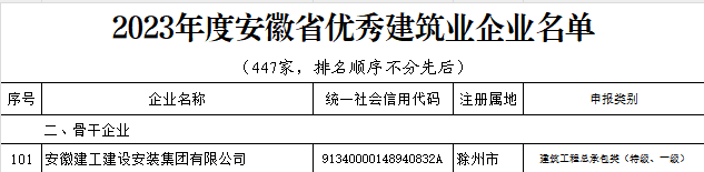 近日,安徽省住房和城鄉(xiāng)建設(shè)廳、安徽省交通運(yùn)輸廳、安徽省水利廳、安徽省通信管理局聯(lián)合發(fā)布《關(guān)于公布2023年度安徽省優(yōu)秀建筑業(yè)企業(yè)名單的通知》(建辦〔2025〕41號(hào)),安徽建工建設(shè)安裝集團(tuán)有限公司入選“2023年度安徽省優(yōu)秀建筑業(yè)企業(yè)”。