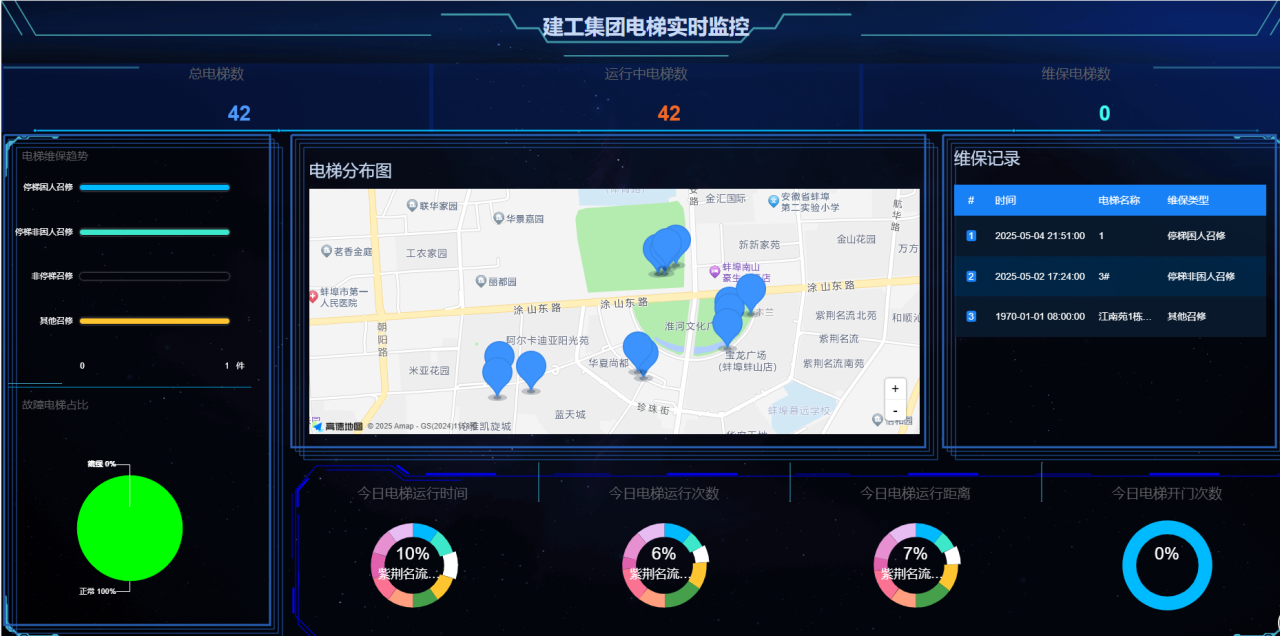 新搭建的電梯管理模塊構(gòu)建起高效的數(shù)據(jù)互通橋梁,不僅能夠?qū)崟r(shí)獲取已上線電梯編號(hào)、電梯設(shè)備名稱等各項(xiàng)基礎(chǔ)數(shù)據(jù),還能精準(zhǔn)監(jiān)測電梯運(yùn)行時(shí)間、運(yùn)行距離、運(yùn)行次數(shù)、開門次數(shù)等動(dòng)態(tài)數(shù)據(jù)信息。該系統(tǒng)可全程追蹤電梯召修記錄,詳細(xì)記錄召修維保上報(bào)時(shí)間、電梯維保人員到場時(shí)間,以及電梯故障處理過程、因故障困人后的解救時(shí)間等信息。這些數(shù)據(jù)的全面整合與實(shí)時(shí)呈現(xiàn),能夠全方位、立體化掌握每臺(tái)電梯的運(yùn)行狀態(tài)及故障率,增強(qiáng)了電梯運(yùn)行的安全性和可靠性,有效提升電梯維保效率。